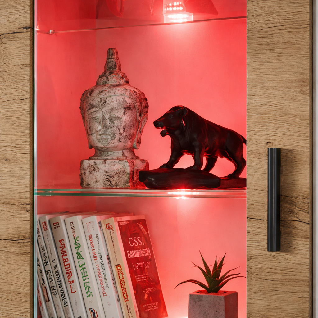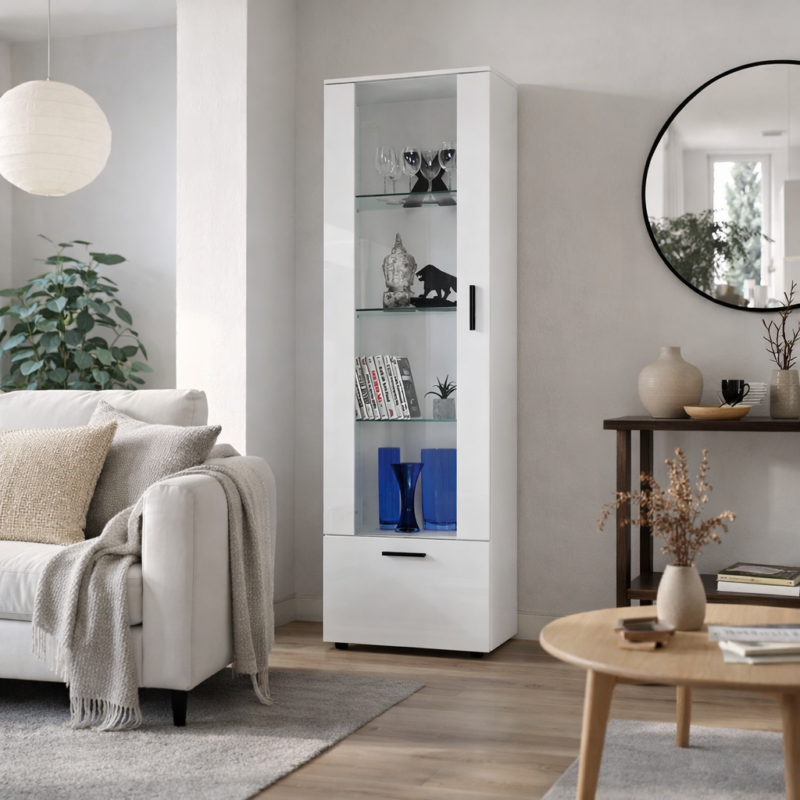 La partie vitrée est idéale pour présenter de la verrerie, des décorations ou des objets de collection, tandis que les étagères fermées inférieures offrent un espace supplémentaire pour les accessoires de maison et les objets du quotidien. En option, la vitrine peut être équipée d'un éclairage LED RGB qui met en valeur le contenu et crée un effet visuel d'ambiance.