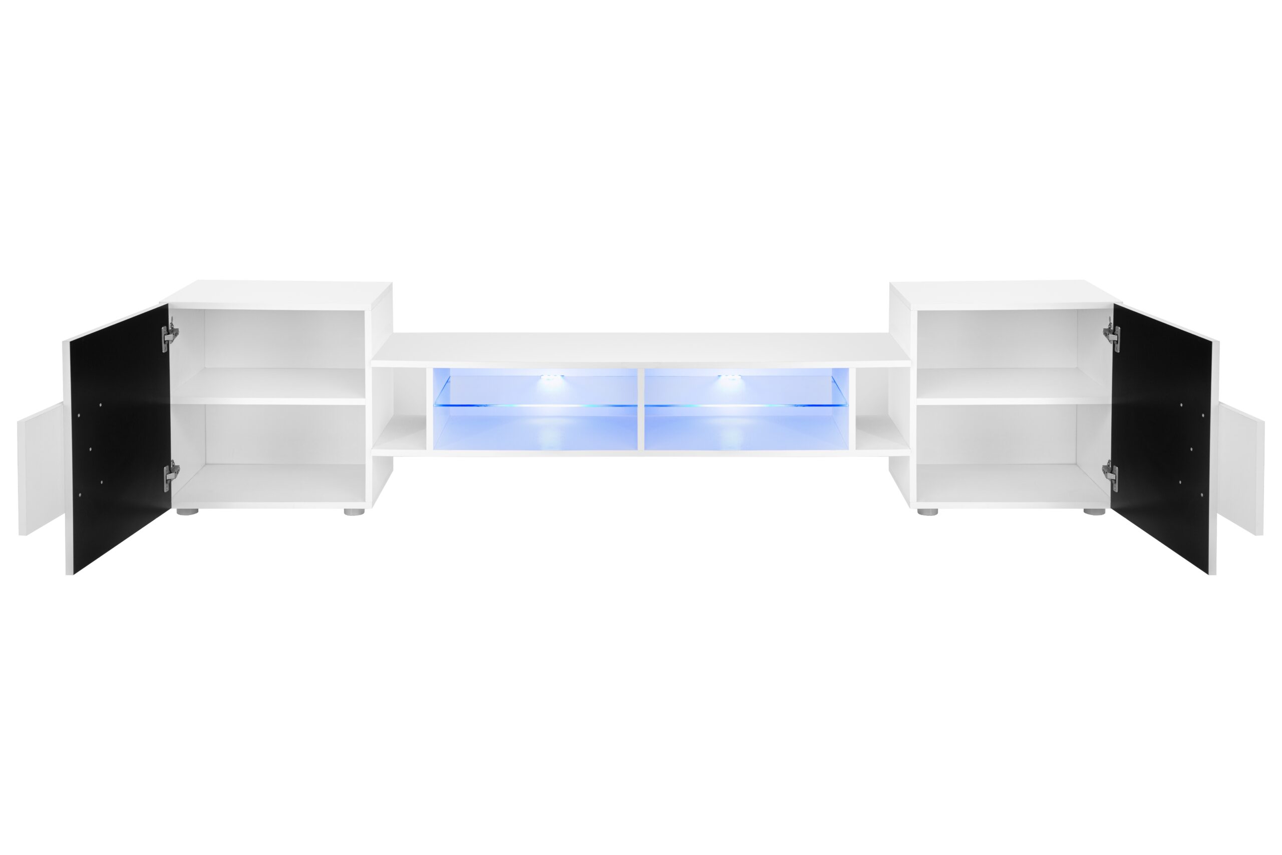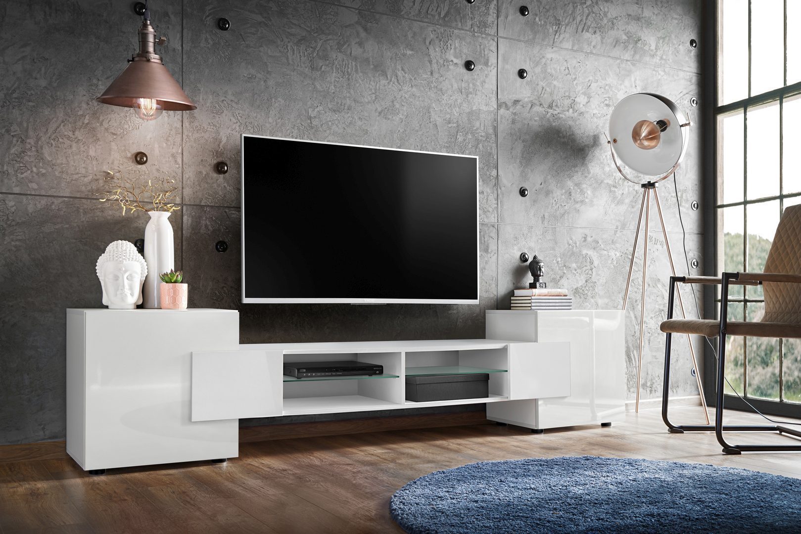 L’armoire TV Merano s’harmonise parfaitement avec différents styles d’intérieur – particulièrement moderne et scandinave. Les façades des armoires extérieures sont brillantes, tandis que le corps et la partie centrale sont mats.