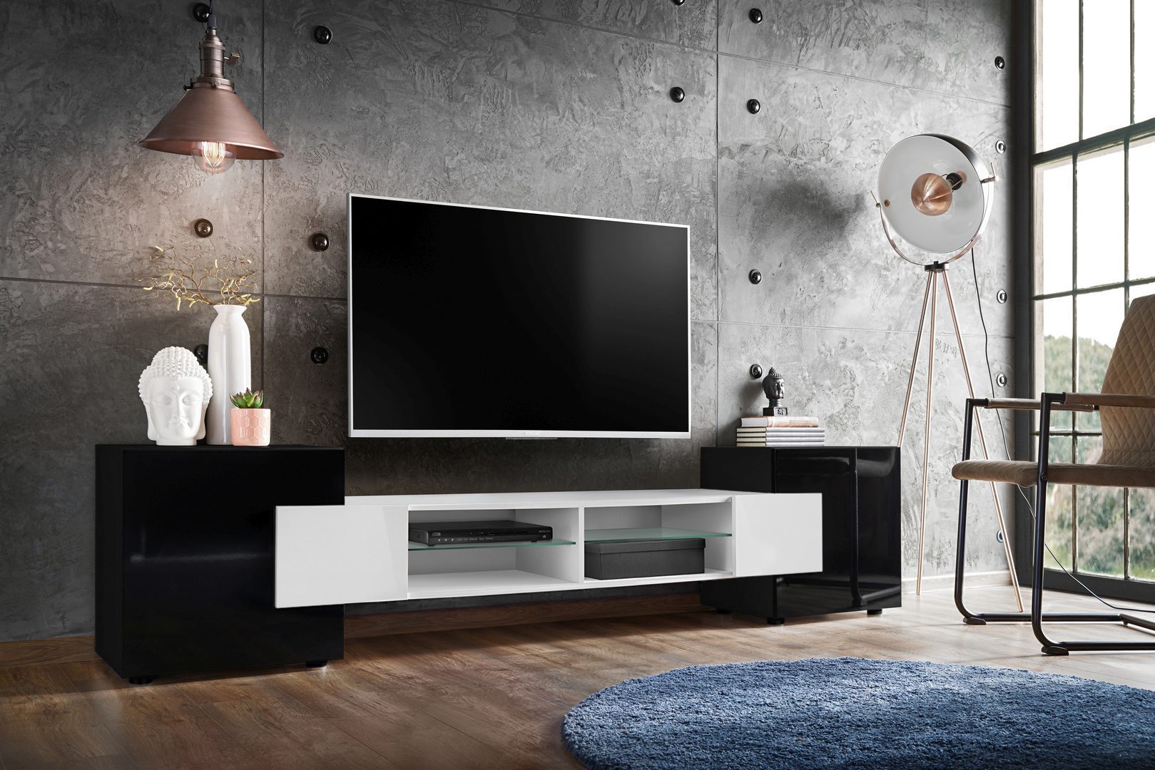 L’armoire TV Merano s’harmonise parfaitement avec différents styles d’intérieur – particulièrement moderne et scandinave. Les façades des armoires extérieures sont brillantes, tandis que le corps et la partie centrale sont mats.
