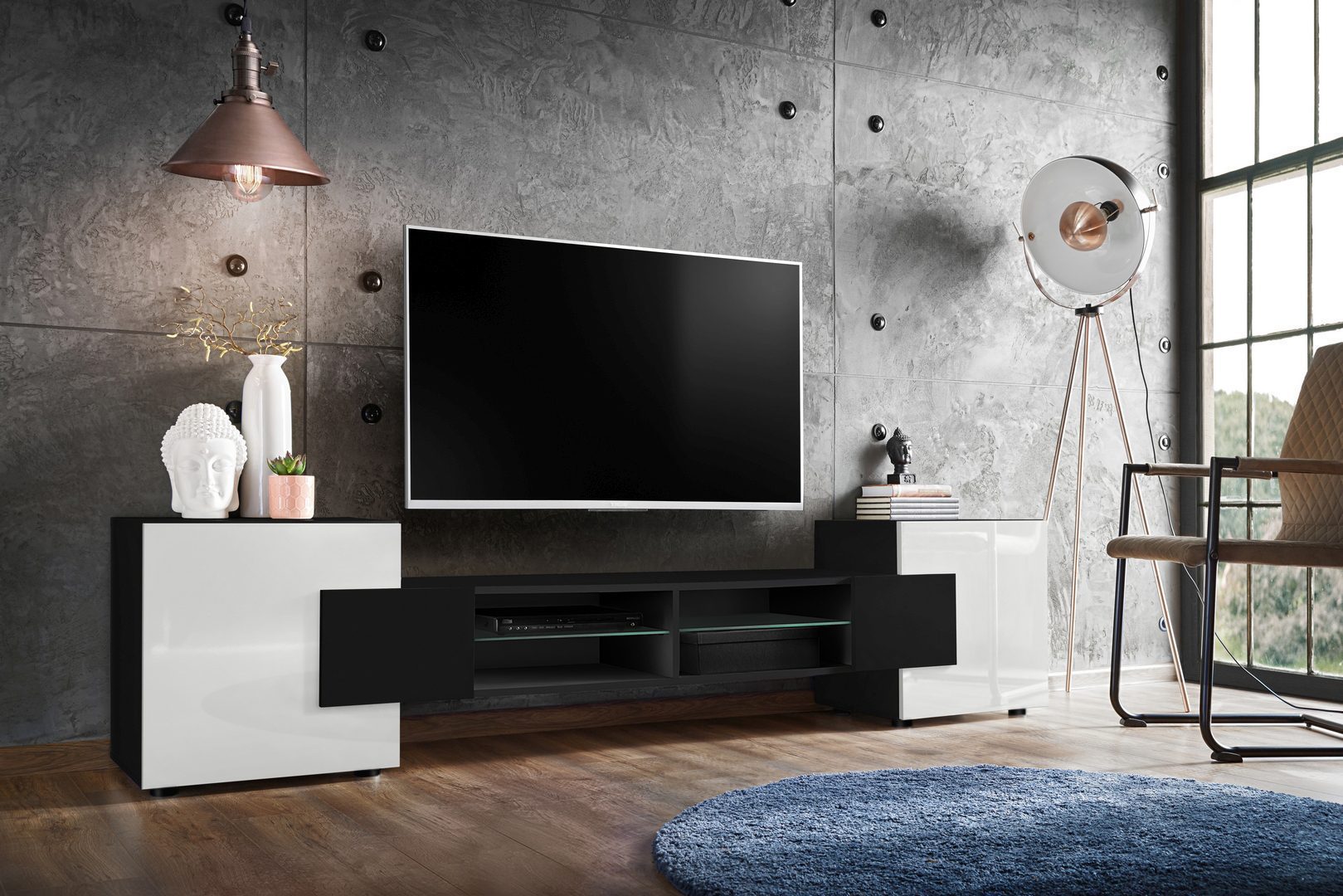 L’armoire TV Merano s’harmonise parfaitement avec différents styles d’intérieur – particulièrement moderne et scandinave. Les façades des armoires extérieures sont brillantes, tandis que le corps et la partie centrale sont mats.