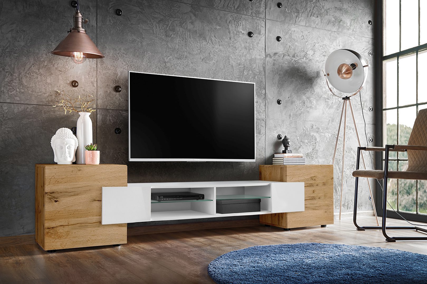 L’armoire TV Merano s’harmonise parfaitement avec différents styles d’intérieur – particulièrement moderne et scandinave. Les façades des armoires extérieures sont brillantes, tandis que le corps et la partie centrale sont mats.