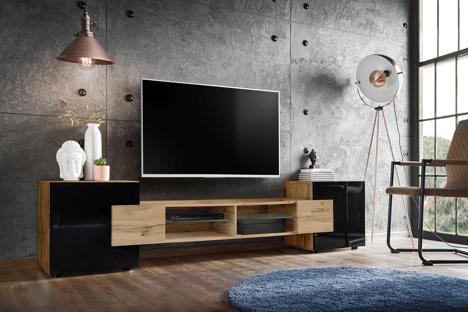 L’armoire TV Merano s’harmonise parfaitement avec différents styles d’intérieur – particulièrement moderne et scandinave. Les façades des armoires extérieures sont brillantes, tandis que le corps et la partie centrale sont mats.