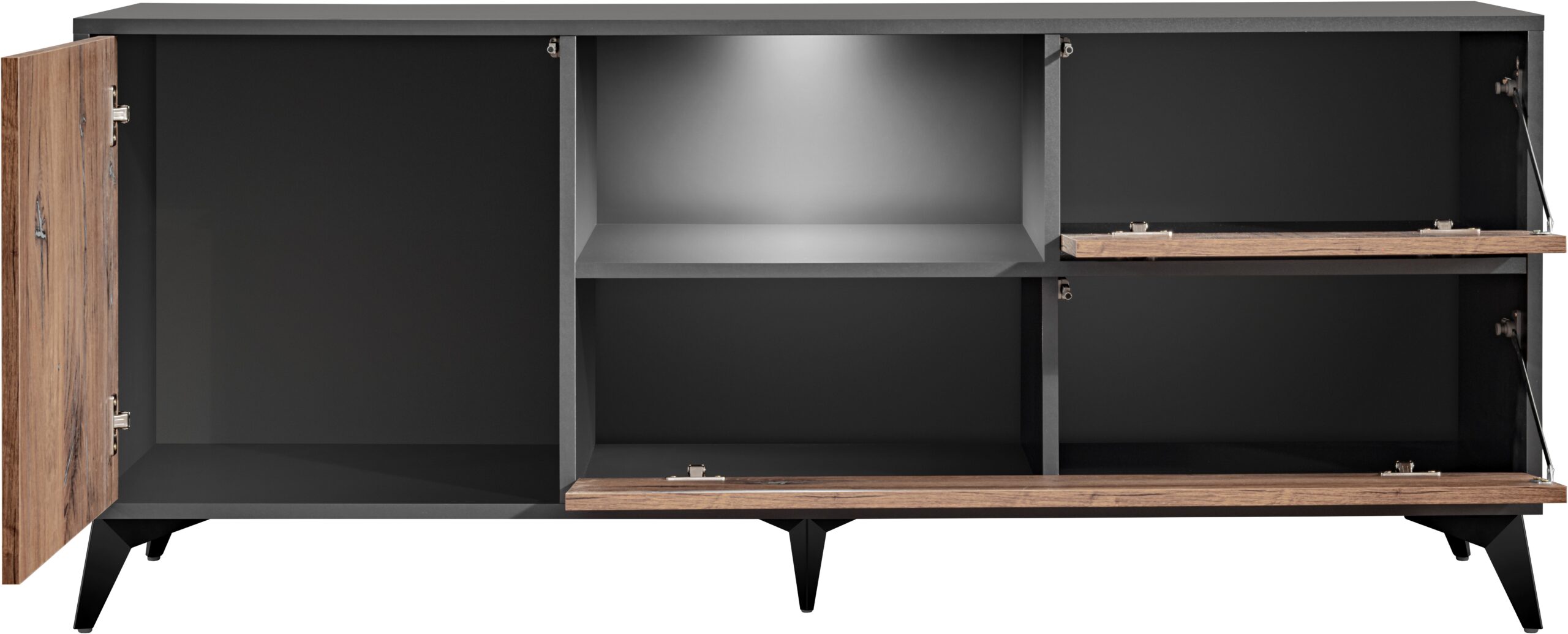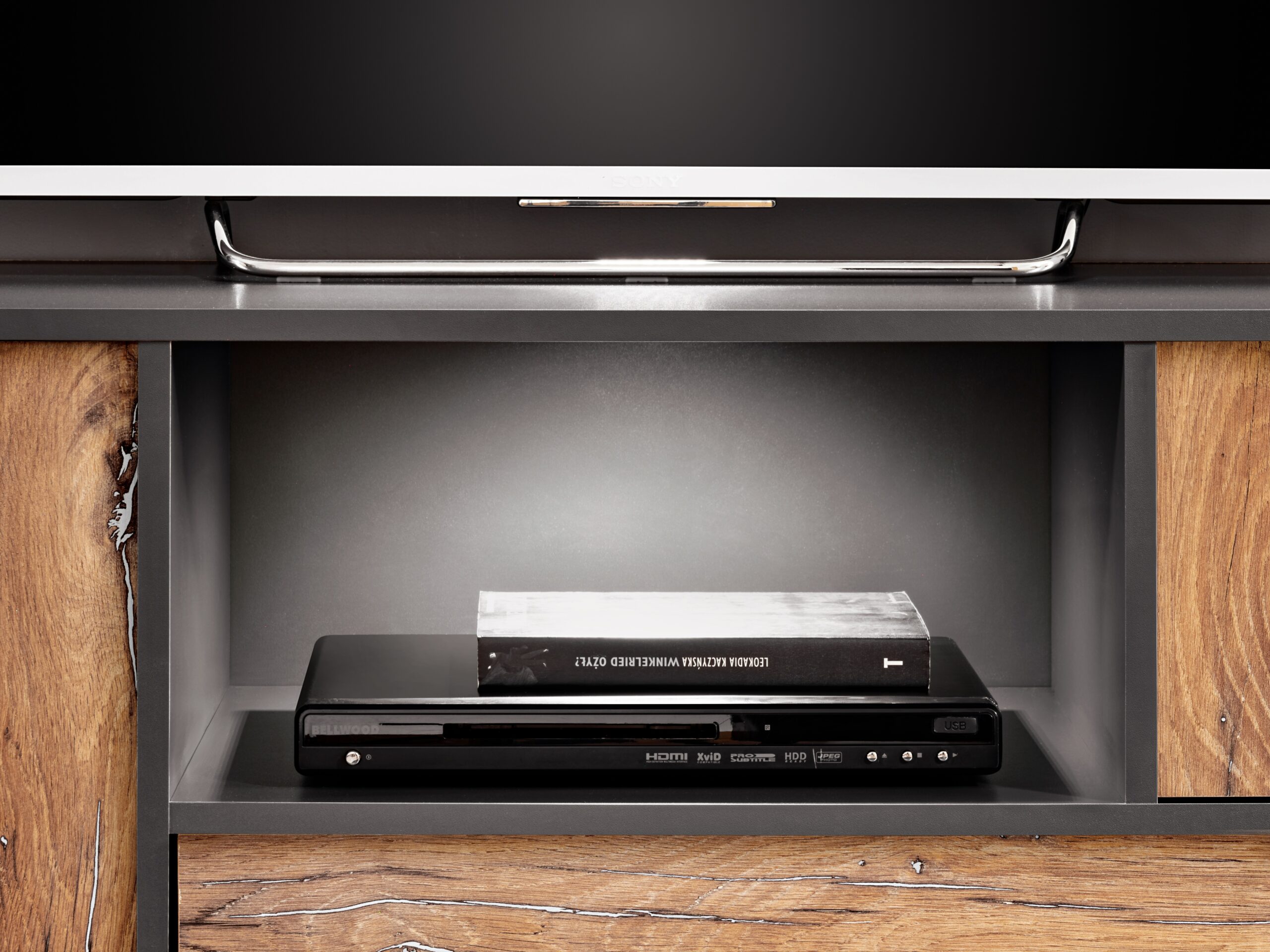 Le meuble offre non seulement de la place pour vos appareils TV et audio, mais aussi pour vos livres préférés, souvenirs ou documents, que vous pouvez ranger dans la partie fermée.