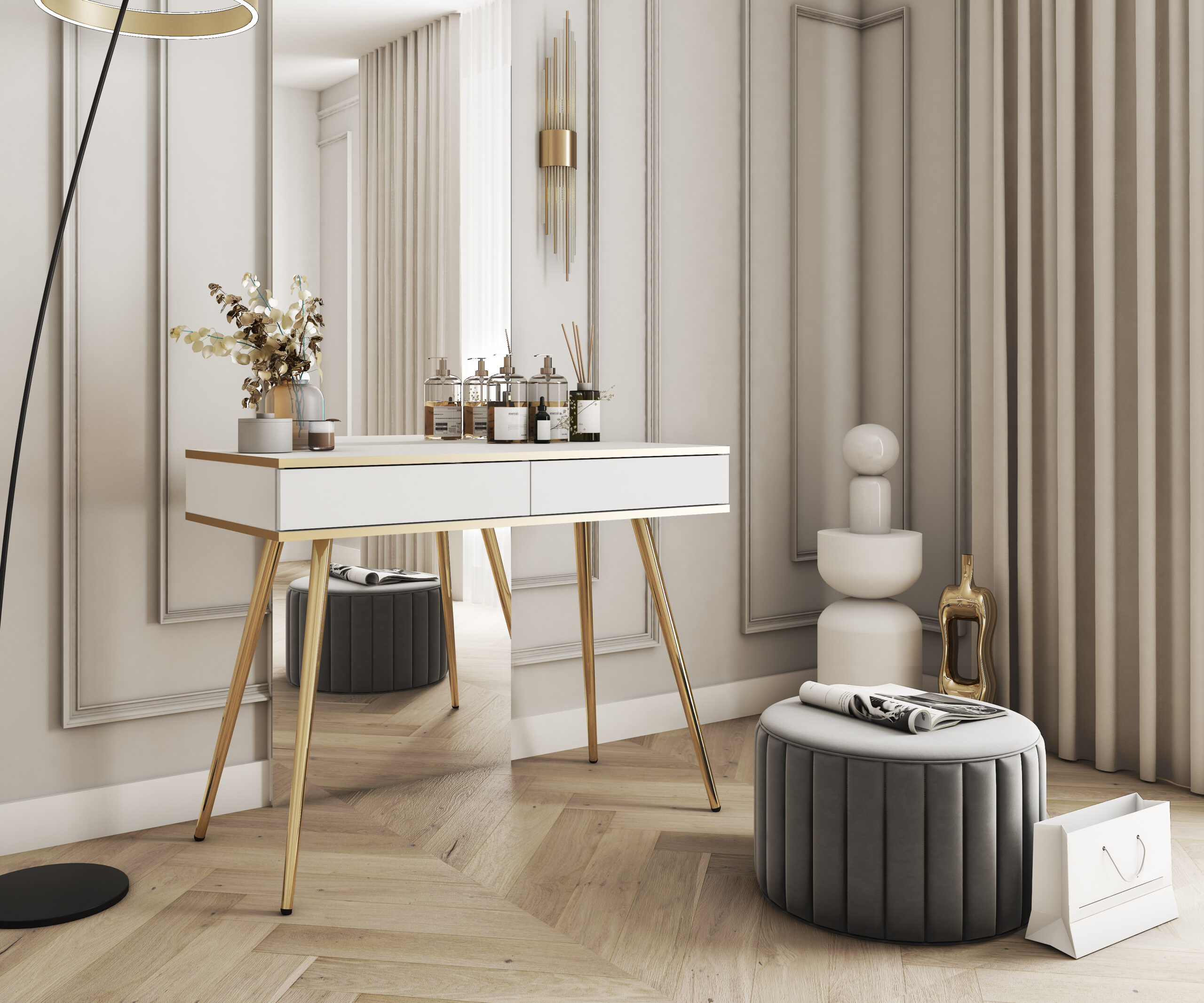La coiffeuse est équipée de deux tiroirs spacieux qui peuvent accueillir des accessoires cosmétiques, des bijoux ou d’autres petits objets. Le plateau de 102 cm de large offre beaucoup d’espace tant pour les tâches de soin quotidiennes que pour l’exposition de décorations, de fleurs ou d’une lampe élégante.