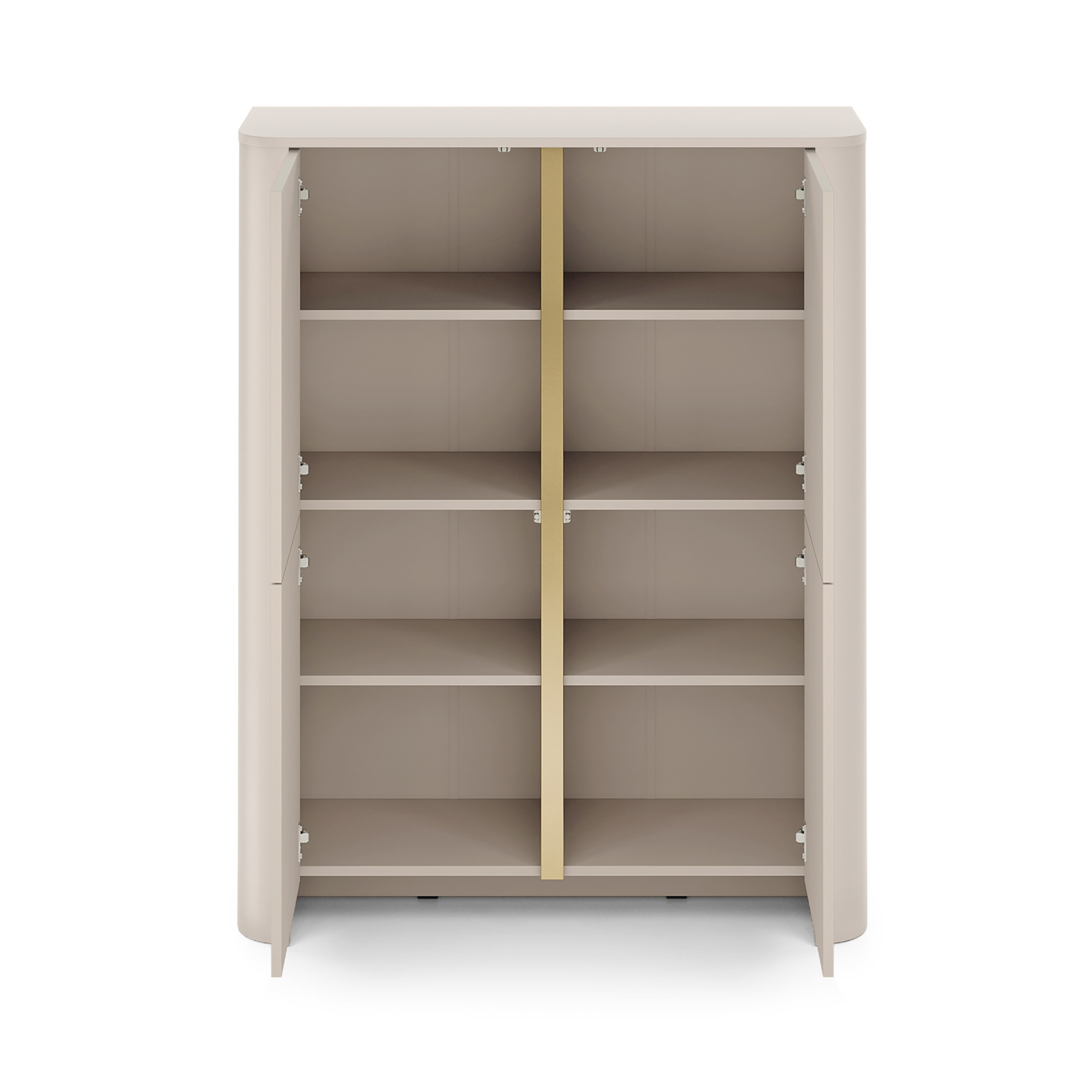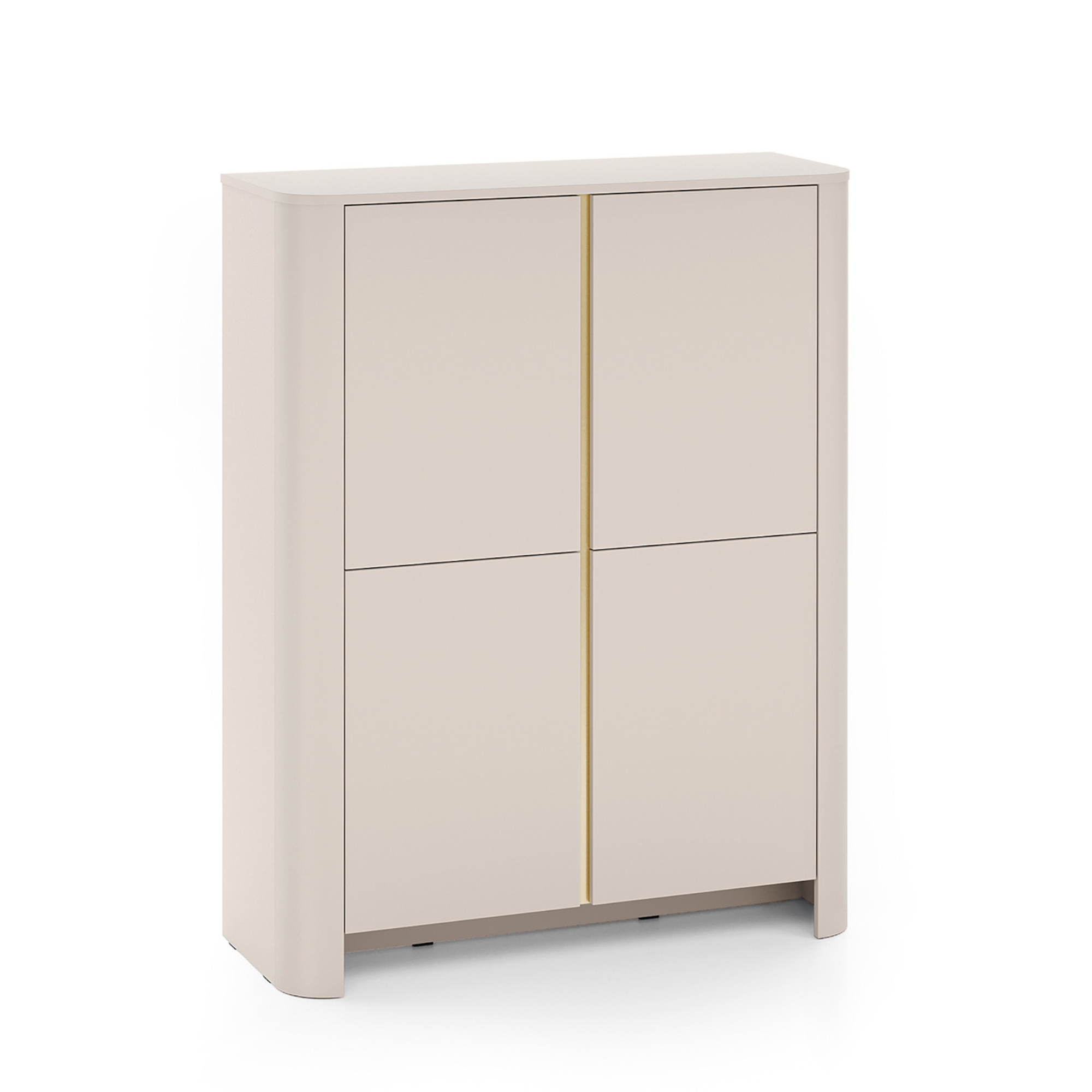 Le corps et les façades sont fabriqués en panneau laminé de 16 mm d’épaisseur, et tous les bords ont été protégés par un bord ABS, ce qui augmente la résistance à l’utilisation quotidienne et assure une finition élégante. L’élément caractéristique de la commode est ses côtés arrondis en panneau MDF de 18 mm, qui ajoutent légèreté, douceur et caractère unique à la forme.