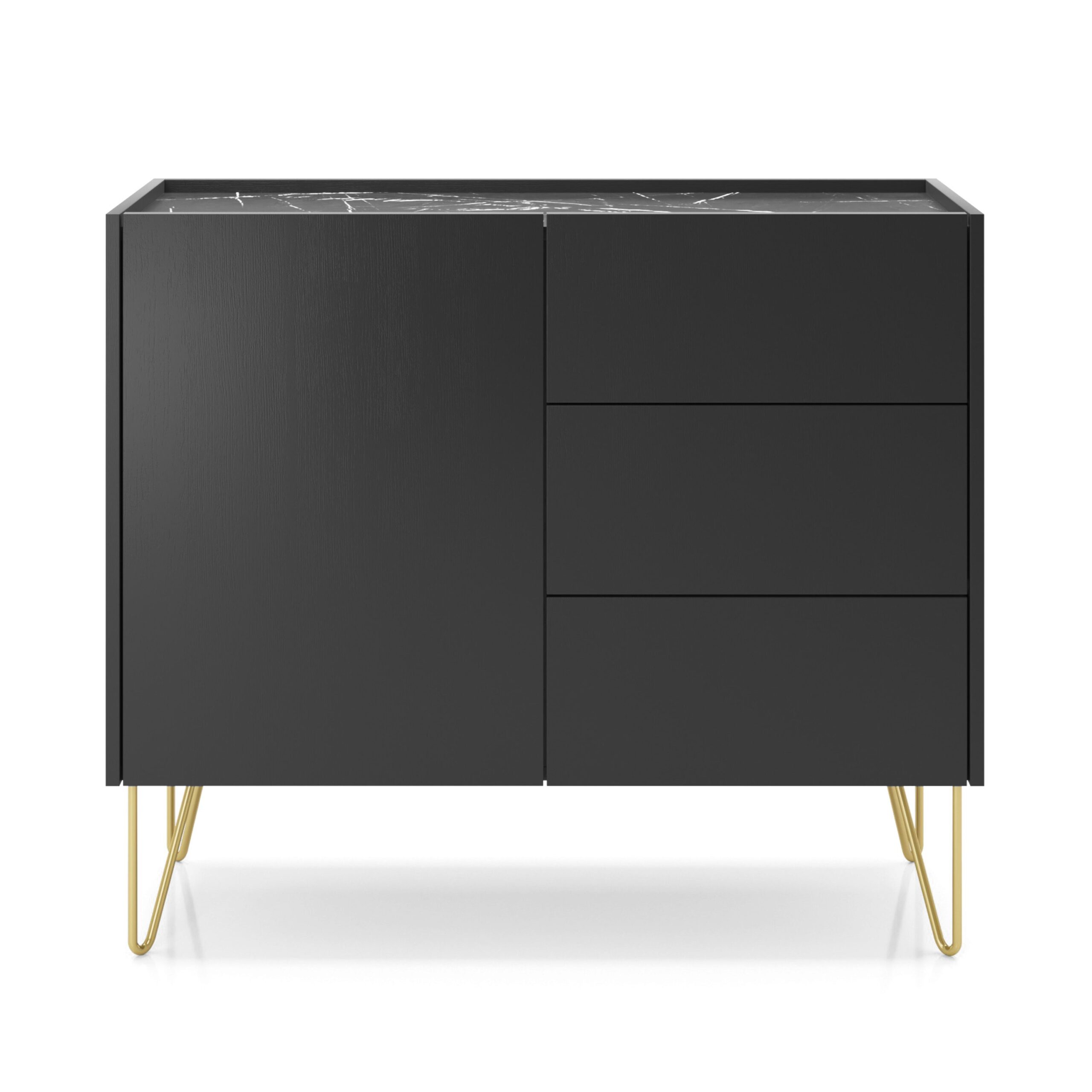La commode Canmore KSZ-97 est une combinaison de fonctionnalité et d’élégance, idéale pour les intérieurs décorés avec style. Un corps noir mat, un plateau en marbre et des pieds dorés et incurvés dans un style rétro créent un ensemble distinct et harmonieux. La commode offre un espace de rangement pratique dans trois tiroirs spacieux ouverts par un système d’ouverture par pression, sans poignées apparentes. Fabriqué en panneau stratifié durable de 16 mm d’épaisseur, fini avec une bordure ABS résistante – assure une durabilité pendant des années. C’est le choix parfait pour ceux qui recherchent un meuble qui combine des fonctions pratiques avec une esthétique originale.