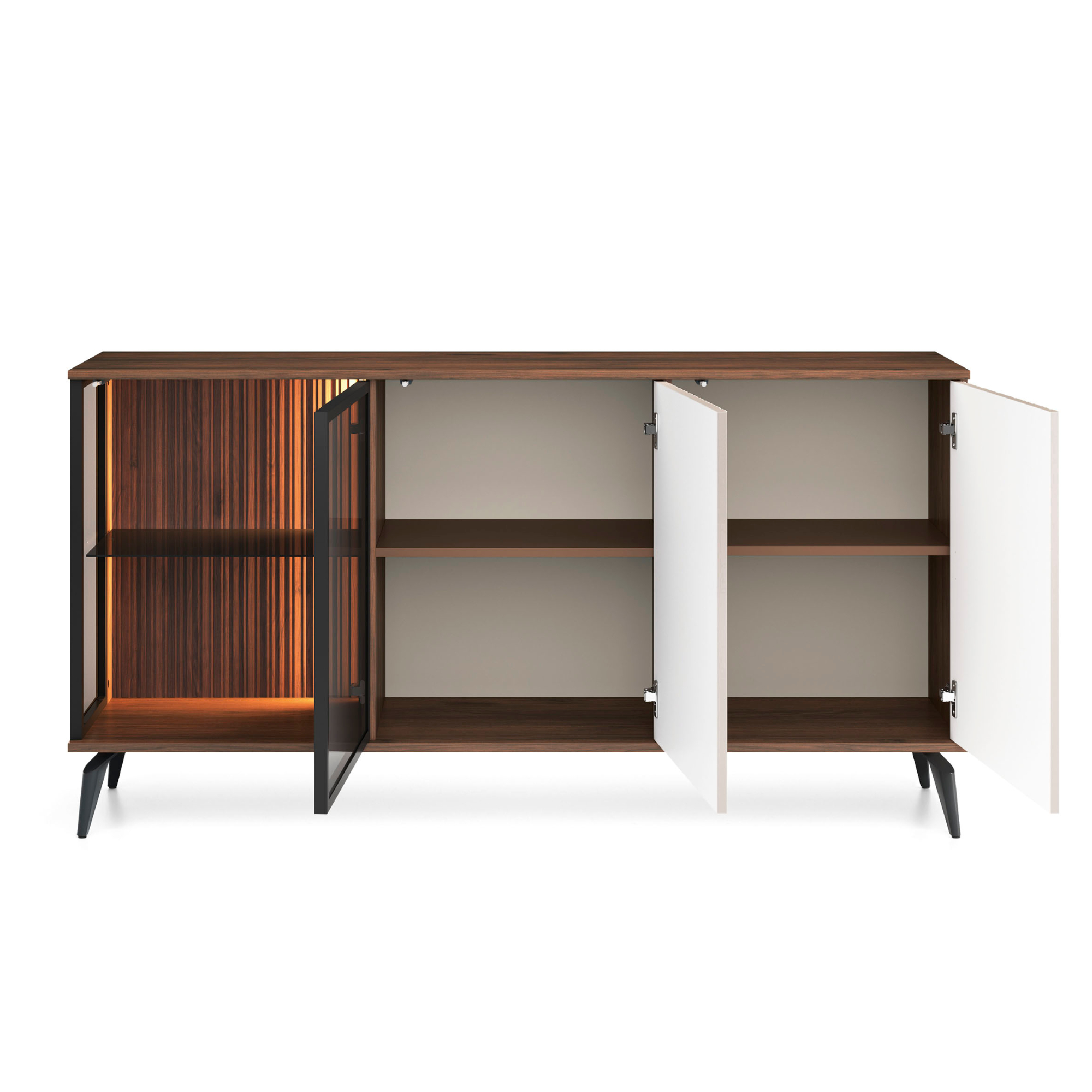 Commode Dawson K154 – Noyer – Cachemire – Vitrée – Éclairage LED – Largeur 154 cm, Hauteur 80 cm, Profondeur 39 cm