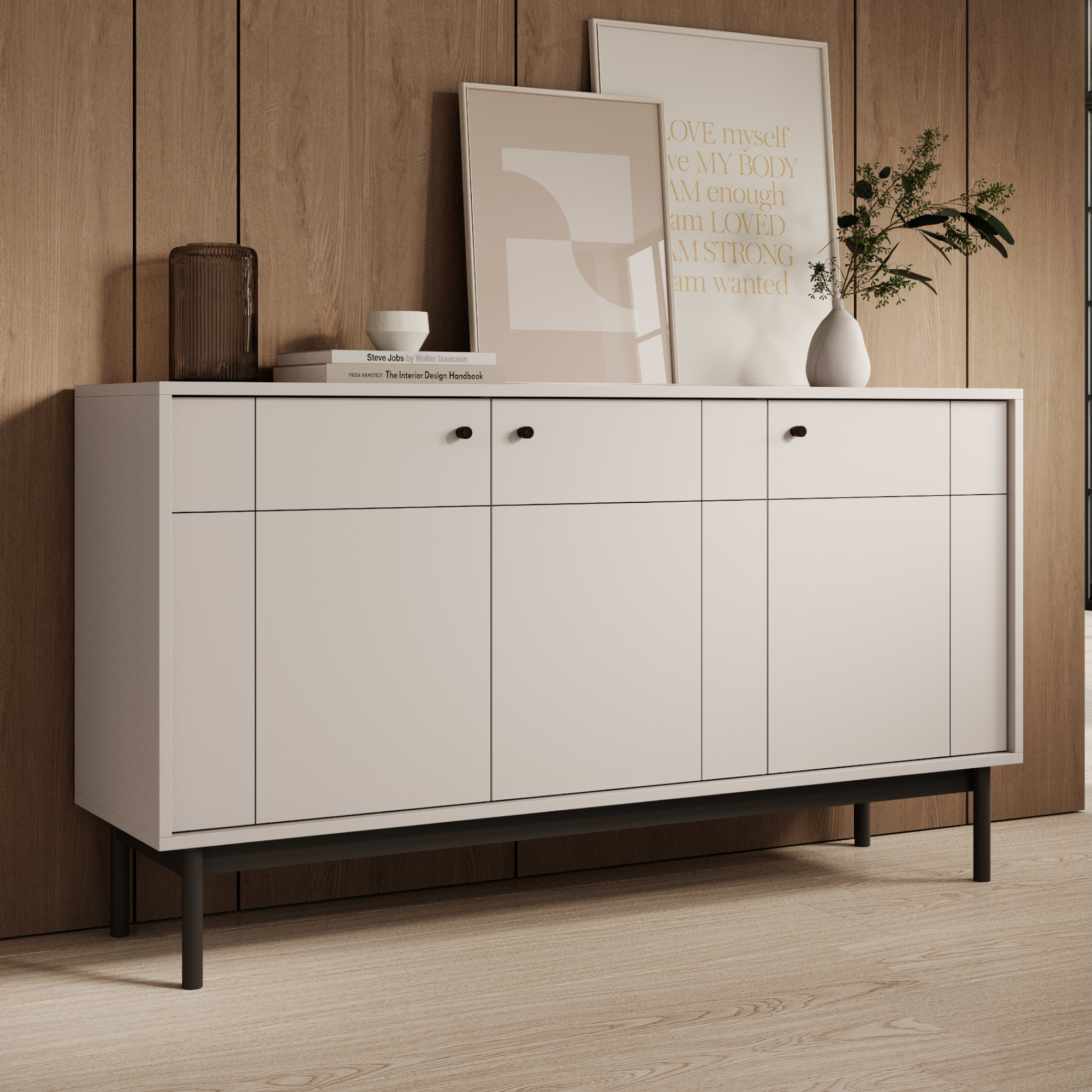 Le meuble repose sur des pieds en bois peints en noir, qui lui confèrent légèreté et stabilité. Les poignées métalliques de couleur noire rompent subtilement la forme naturelle, soulignant le caractère moderne de la commode. Les façades sont équipées de charnières à fermeture douce, qui assurent un confort d’utilisation et préviennent l’usure rapide.