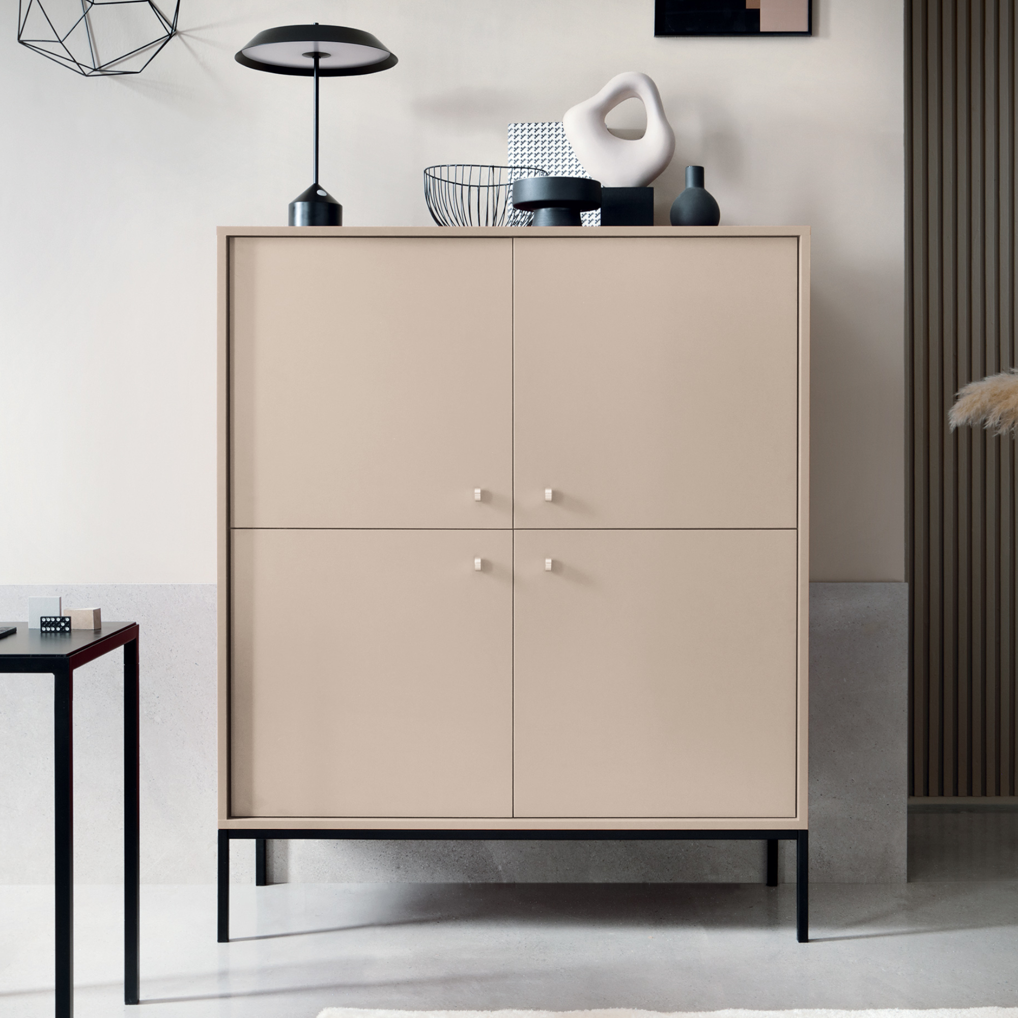 Derrière les quatre façades se cachent jusqu’à huit étagères spacieuses, qui peuvent accueillir des vêtements, des textiles, des documents ou de petits appareils électroniques. Les poignées en métal facilitent l’utilisation quotidienne et donnent à l’ensemble un caractère moderne.