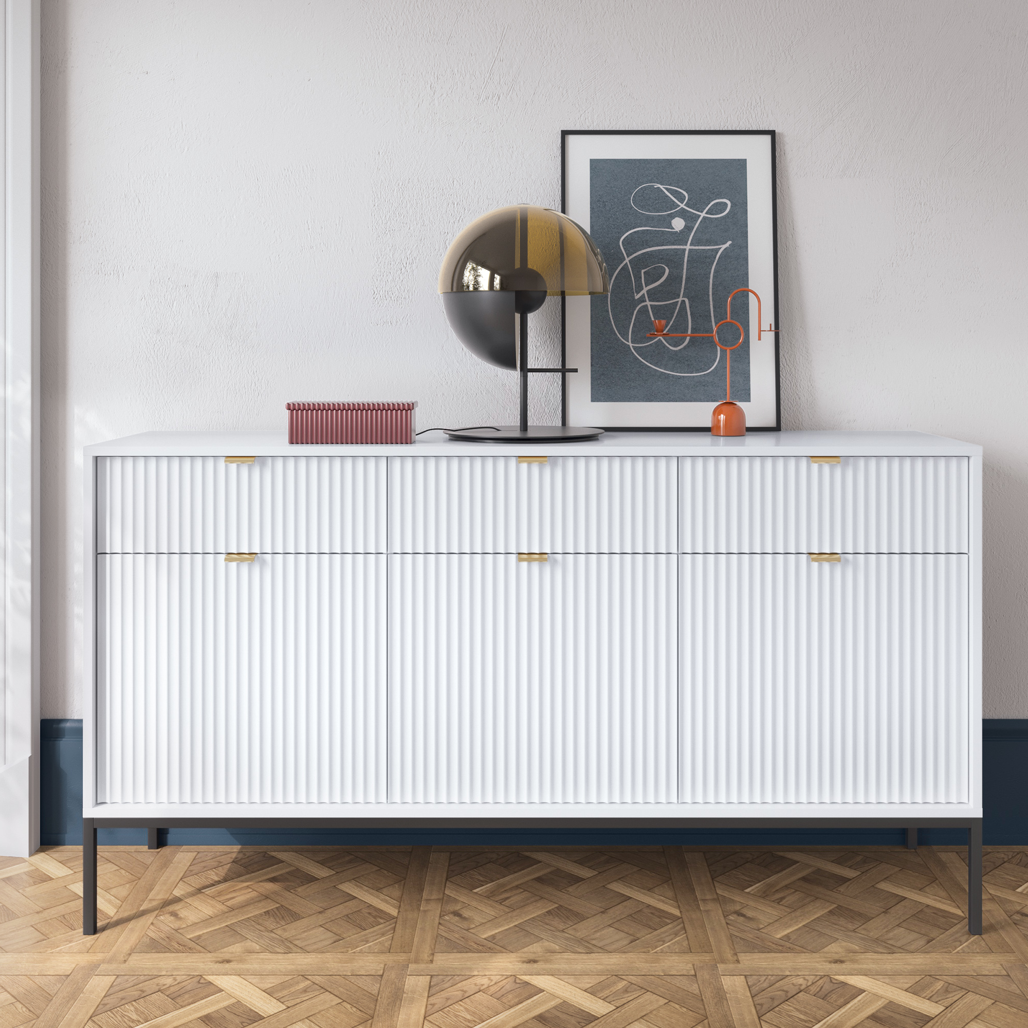 Le meuble se distingue par ses façades rainurées, son cadre en acier géométrique et ses élégantes poignées en aluminium brossé, qui attirent les regards et donnent un caractère unique à l’ensemble. La commode est disponible en 5 couleurs à la mode : cachemire, blanc, vert, noir et gris, ce qui permet de l’adapter facilement à la décoration intérieure.