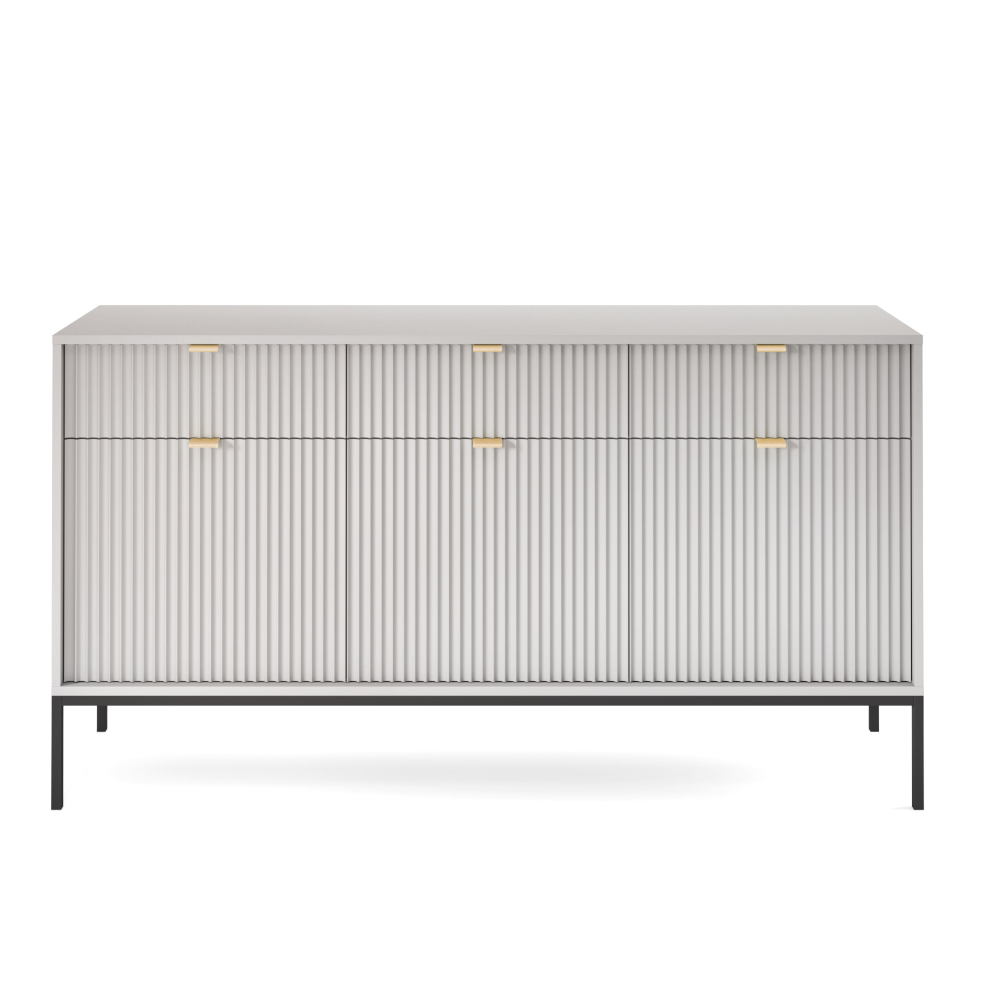 Le meuble se distingue par ses façades rainurées, son cadre en acier géométrique et ses élégantes poignées en aluminium brossé, qui attirent les regards et donnent un caractère unique à l’ensemble. La commode est disponible en 5 couleurs à la mode : cachemire, blanc, vert, noir et gris, ce qui permet de l’adapter facilement à la décoration intérieure.
