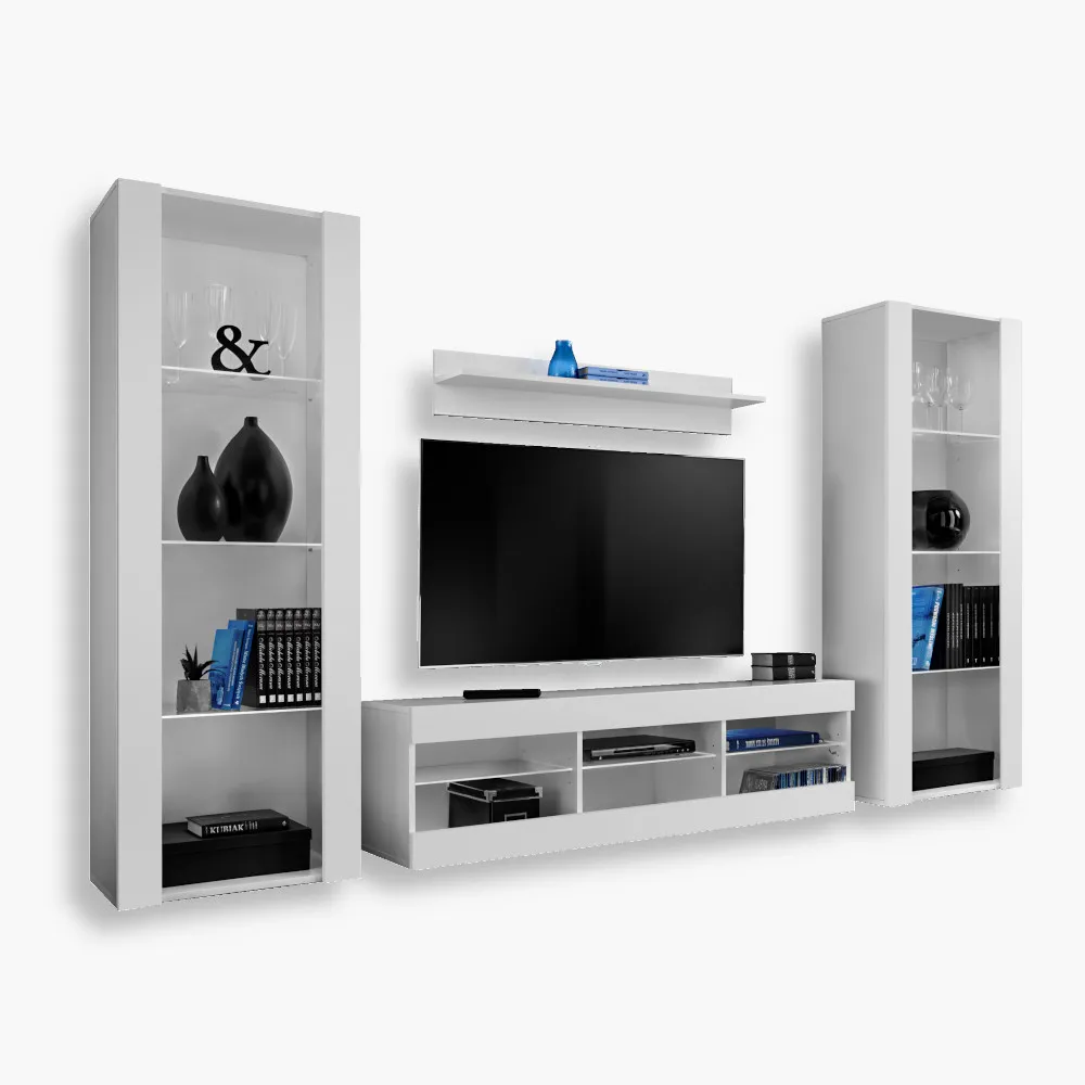 GRANDS RANGEMENTS : Ce mobilier comprend 2 vitrines, une étagère et un meuble TV. Il garantit suffisamment d’espace pour ranger vos livres, sets de porcelaine, disques, documents, collections de souvenirs, de gadgets ou d’objets d’art.