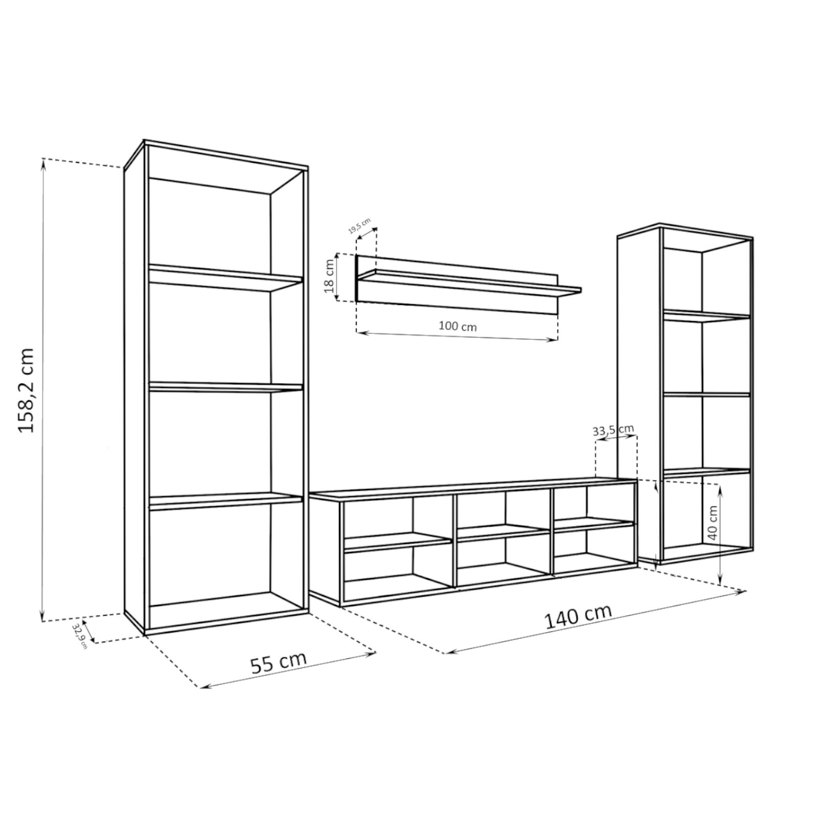 • Meuble TV debout large de 140 cm x haut de 40 cm x profonde de 33,5 cm, 3 étagères, il accueillira un téléviseur jusqu’à 55 Pouces