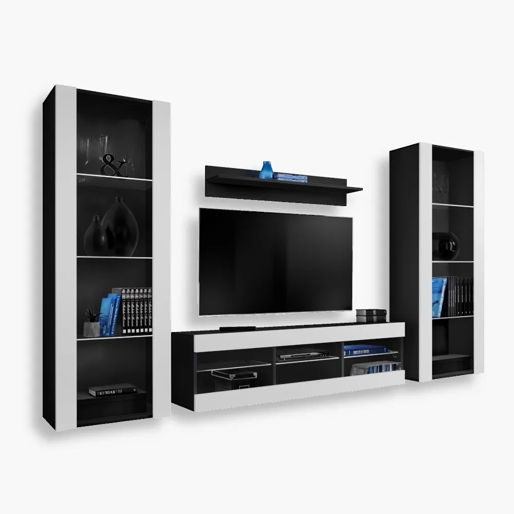 GRANDS RANGEMENTS : Ce mobilier comprend 2 vitrines, une étagère et un meuble TV. Il garantit suffisamment d’espace pour ranger vos livres, sets de porcelaine, disques, documents, collections de souvenirs, de gadgets ou d’objets d’art.