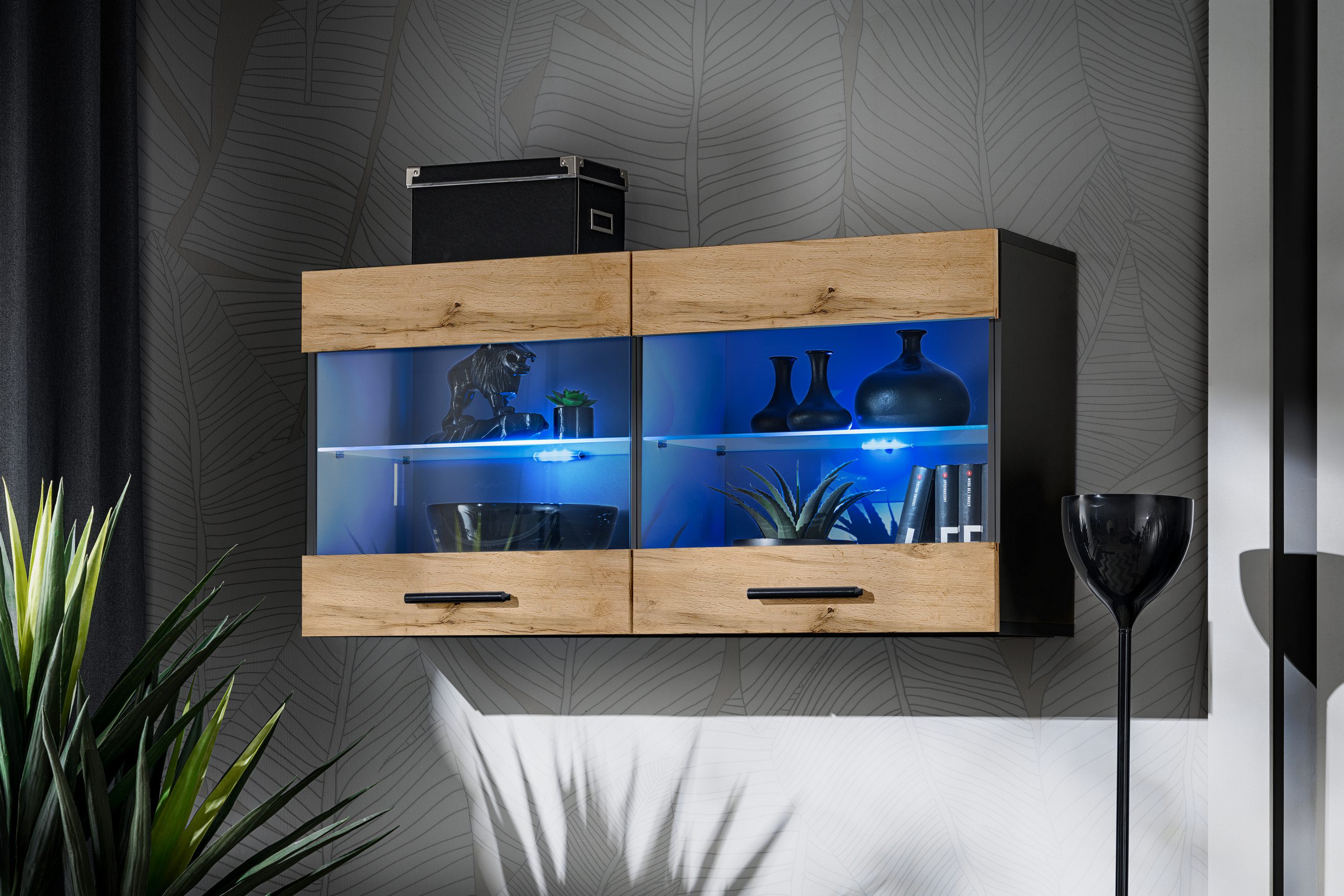 Etagère suspendue Savona, Wotan/Noir Eclairage LED Bleu