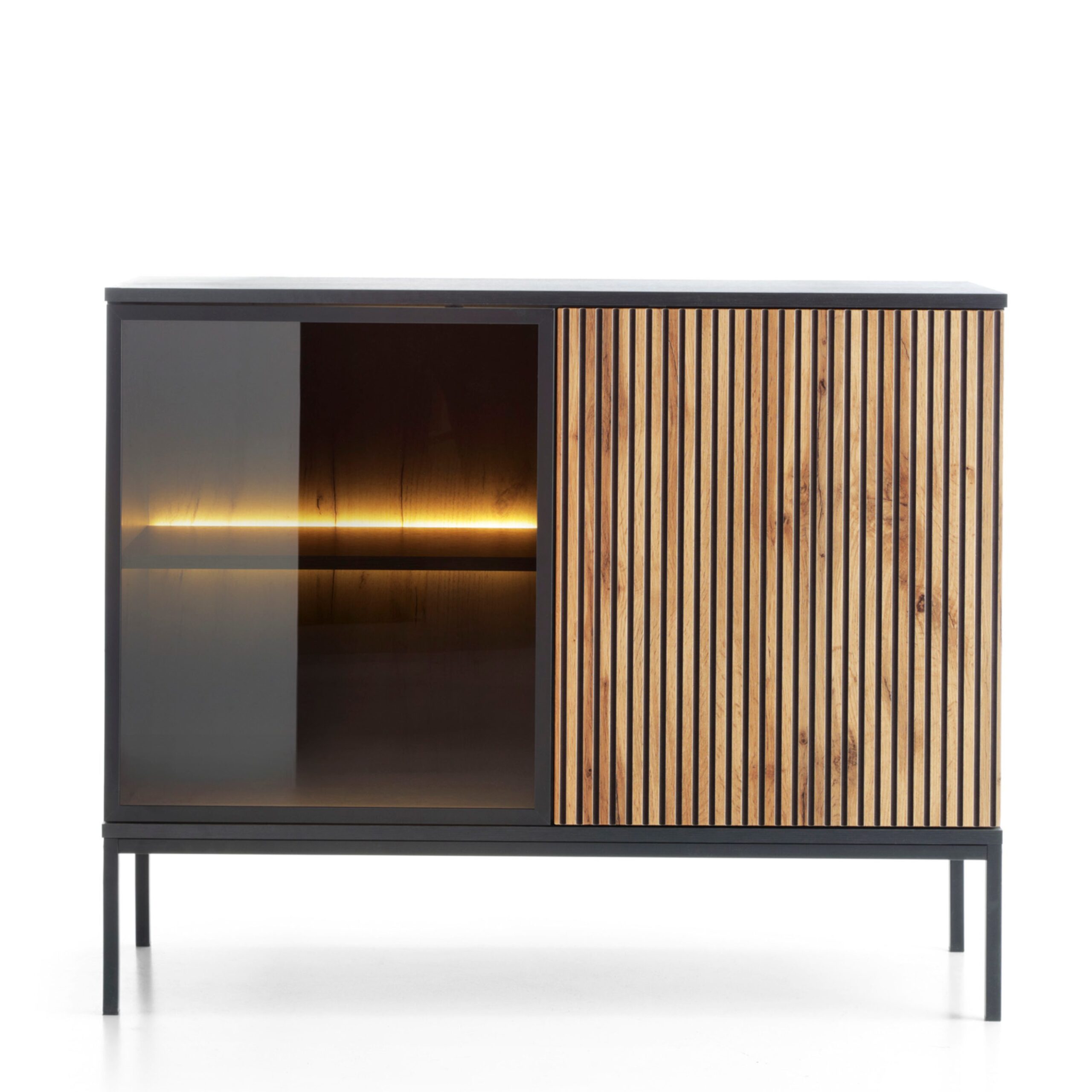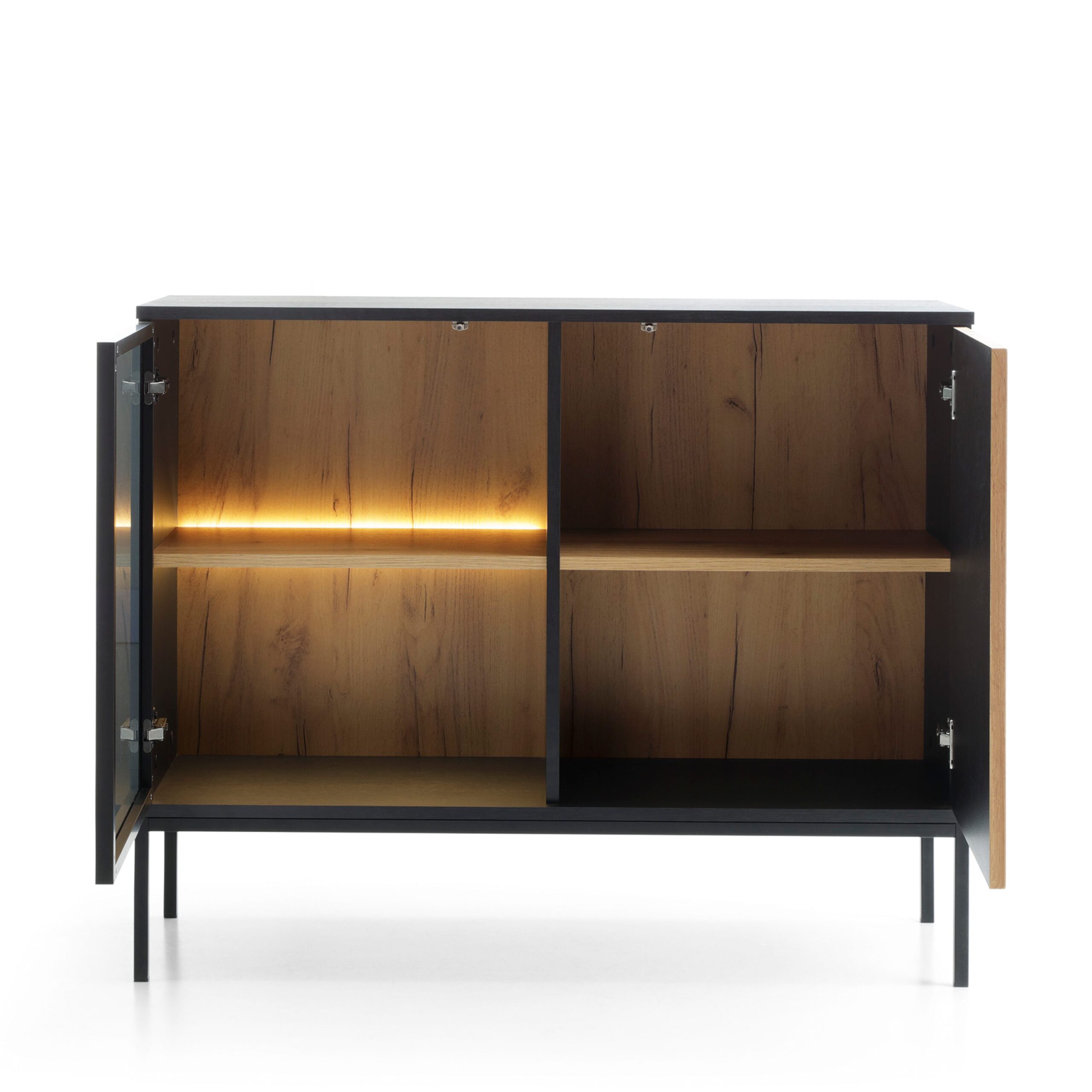 Laval K104 LED – commode à trois portes avec éclairage, noir, chêne wotan, largeur 104 cm, hauteur 83 cm, profondeur 39 cm