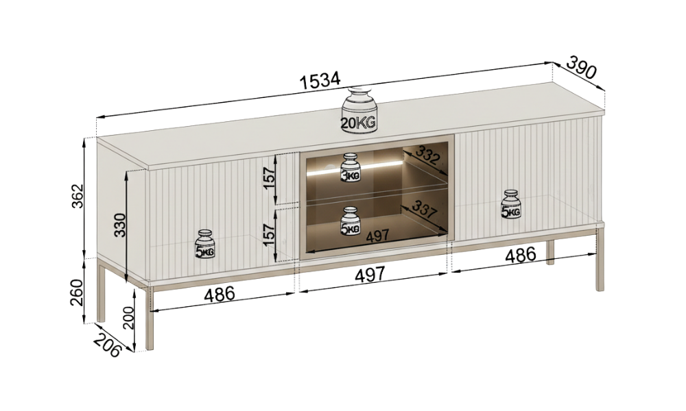 Laval RTV154 – Meuble TV, cachemire, largeur 154 cm, hauteur 56 cm, profondeur 39 cm