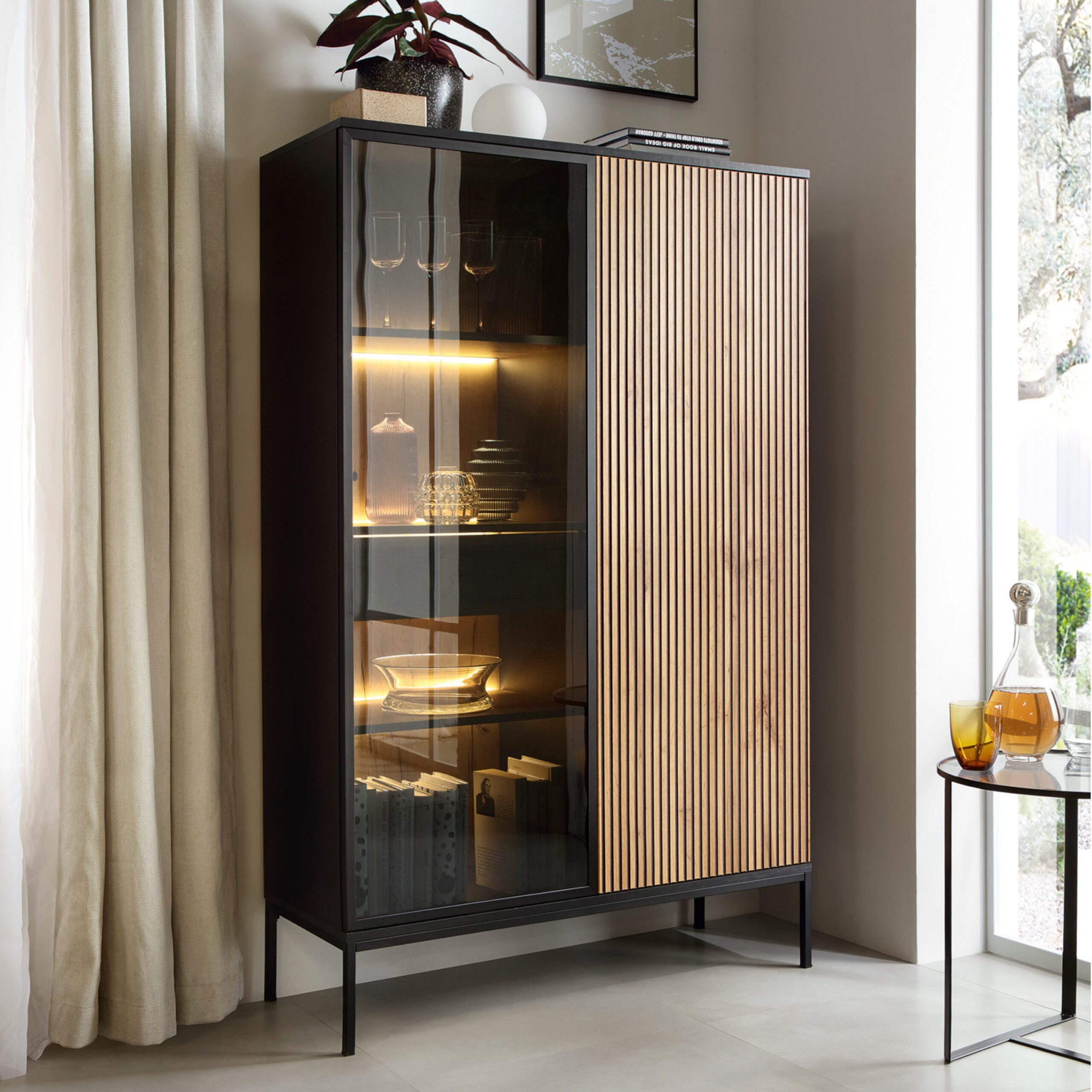 Laval WTSZ104 – vitrine avec éclairage LED, noir, chêne wotan, lame, largeur 104 cm, hauteur 166 cm, profondeur 39 cm