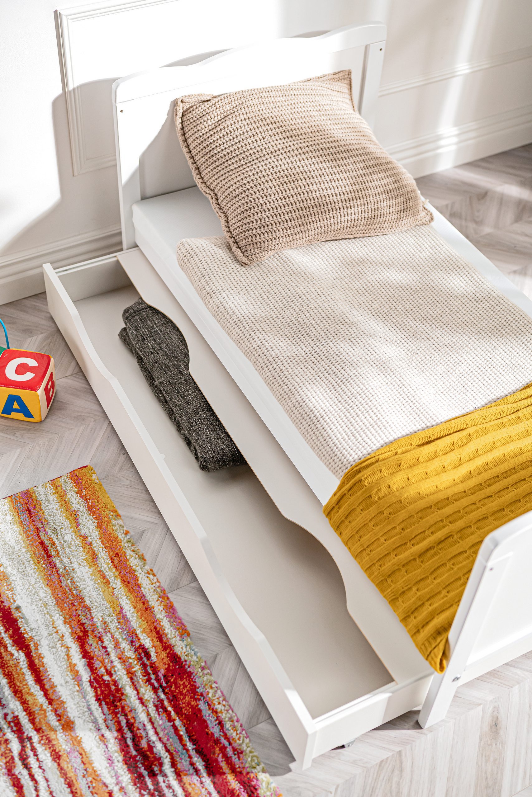 Aurora conviendra parfaitement aux nourrissons et aux enfants plus âgés. Le fond du lit d’enfant peut être réglé sur 3 niveaux. En outre, il peut être déplié pour servir aux enfants plus âgés, voire aux enfants de 4 ans.