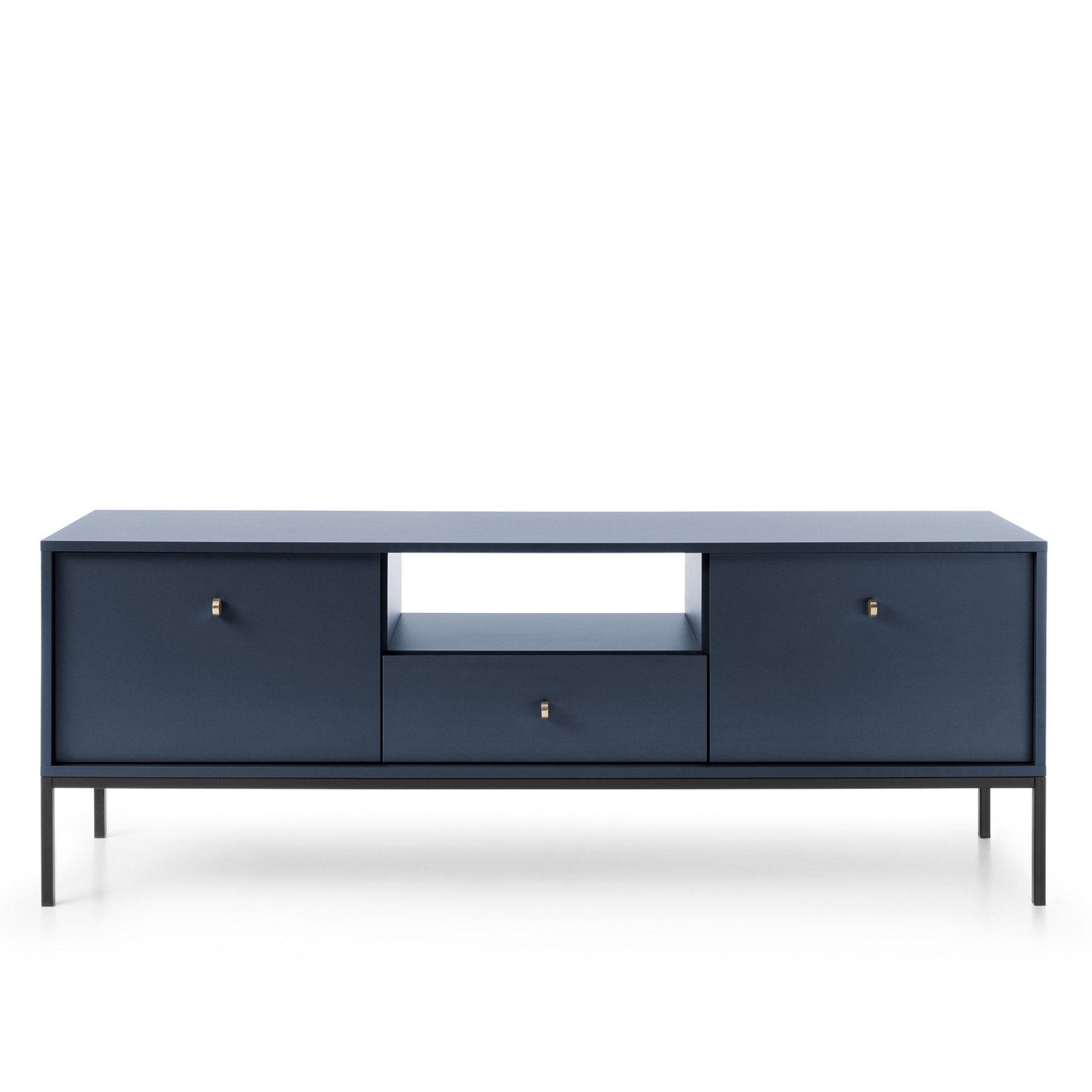 Meuble TV MONCTON – Bleu marine – Poignées métalliques – Largeur 154 cm, Hauteur 56 cm, Profondeur 39 cm