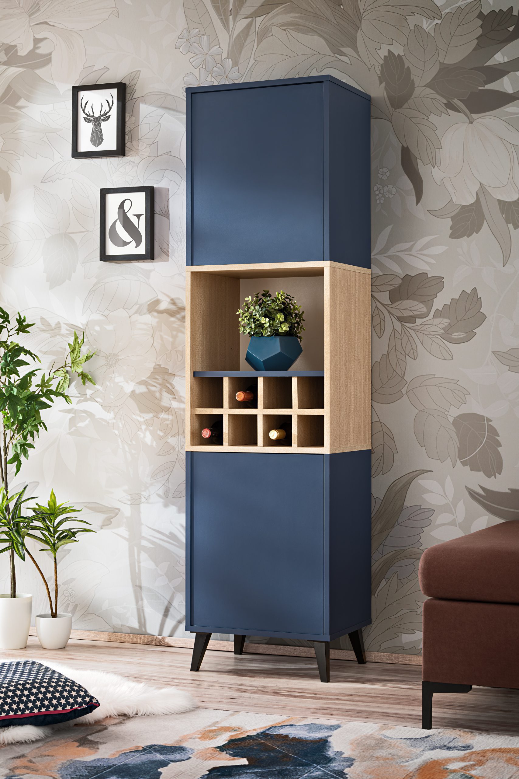 L’étagère Fondi est un meuble extrêmement polyvalent. Vous avez sûrement remarqué la niche ouverte avec une étagère. Vous pouvez y ranger des livres, des documents, mais aussi des disques. Deux autres grandes niches vous permettent de ranger d’autres objets. Elles sont équipées de portes avec un système de fermeture douce. Cela facilite le maintien de l’ordre. L’étagère est extrêmement polyvalente. Une partie de l’étagère est un casier à vin amovible pour 8 bouteilles. Cela rend le meuble parfait non seulement pour le bureau, le salon, la bibliothèque personnelle ou la chambre, mais aussi pour la salle à manger ou la cuisine. Lorsque vous achetez l’armoire Fondi, vous devez simplement savoir que vous avez besoin d’espace de rangement. Le meuble s’adapte à vos besoins, même s’ils évoluent avec le temps.L’étagère est fabriquée en panneaux durables et résistants aux rayures. Grâce aux couleurs originales – bleu foncé combiné avec du sapin scandinave – et à un design intemporel, l’étagère s’intègre parfaitement dans divers intérieurs : modernes, minimalistes, scandinaves et industriels. Les pieds, inspirés des meubles des années 60 et 70, ajoutent une élégance discrète.L’étagère et les autres meubles de la série Fondi s’adaptent également parfaitement aux petits appartements.Buffet Fondi :