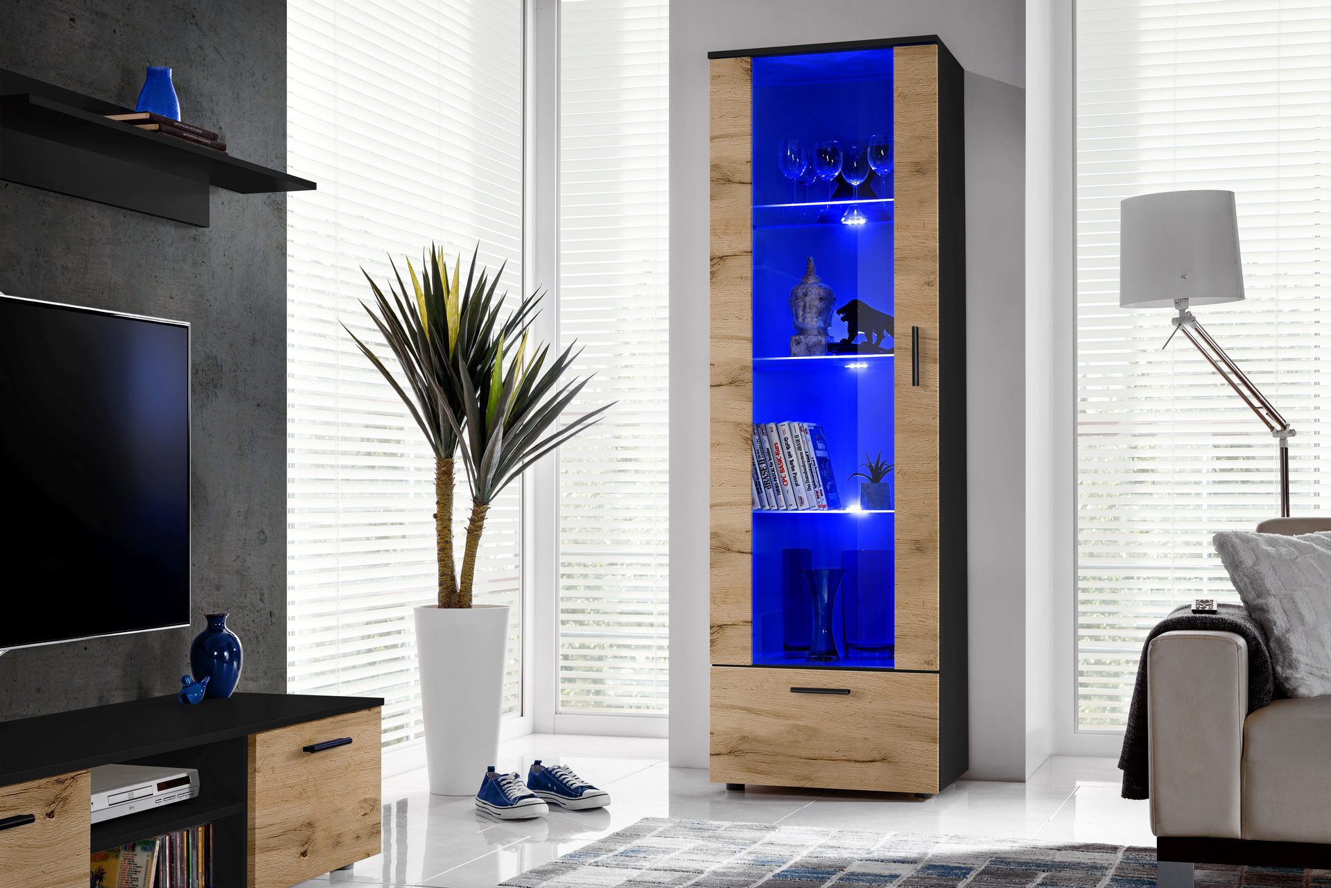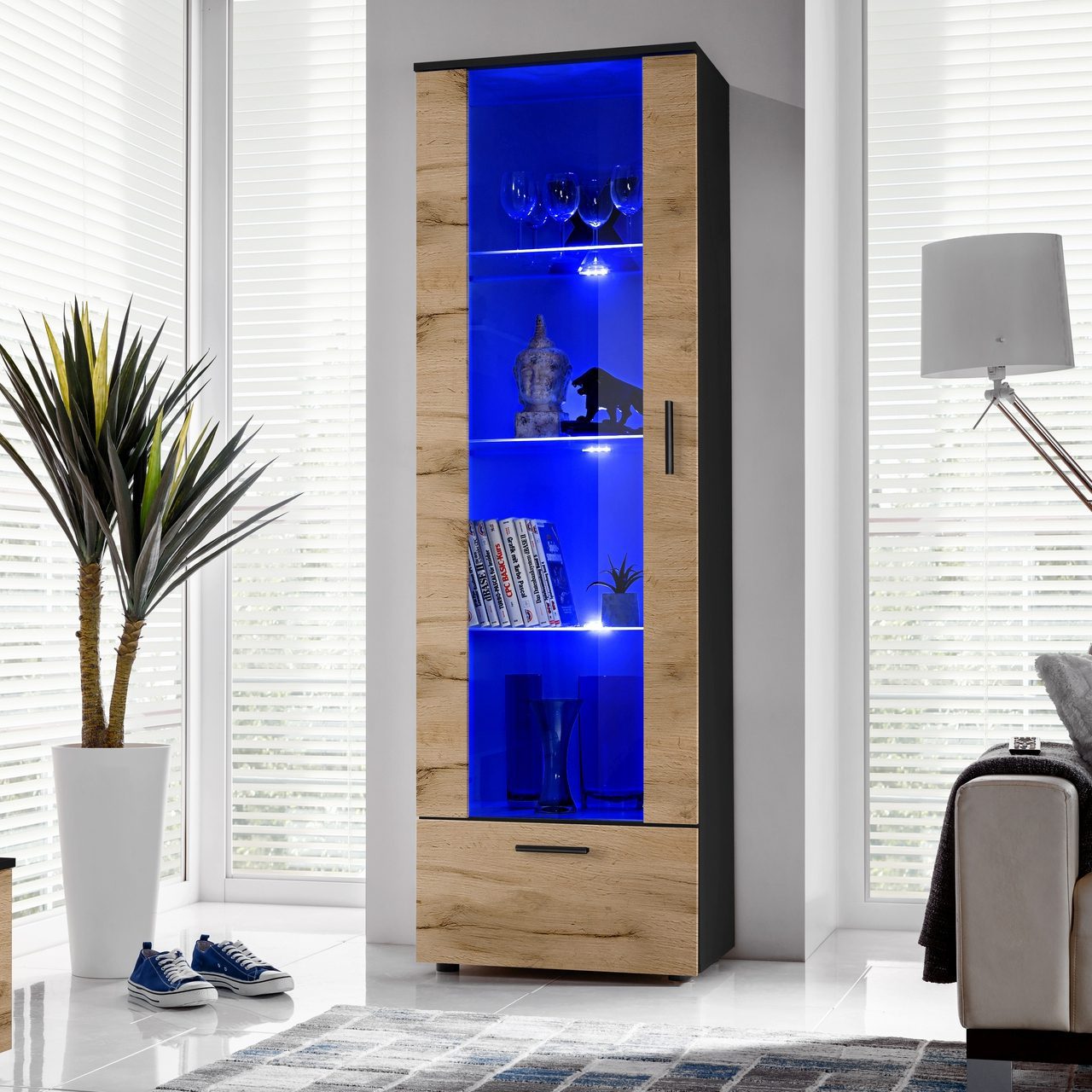 Présentoir sur pied Alessandria, Wotan/noir Éclairage LED bleu