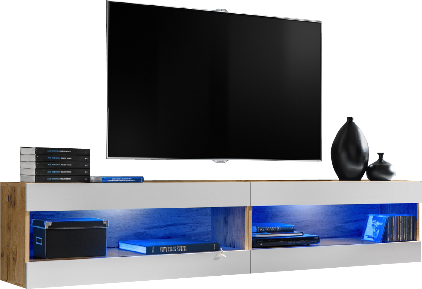 Set Meubles, Tivoli SET4, Wotan/Blanc, Largeur 200cm x Hauteur 41cm x Profondeur 35cm, LED Bleu, pour Salon, Chambre à coucher