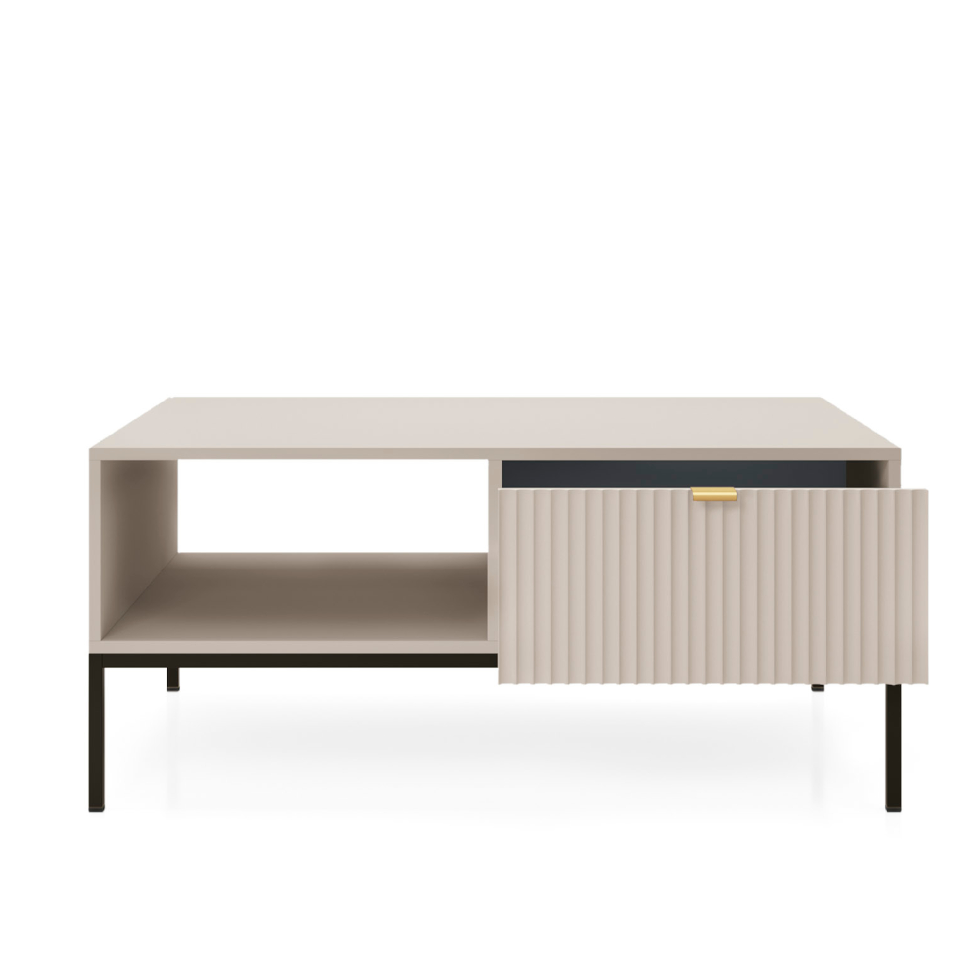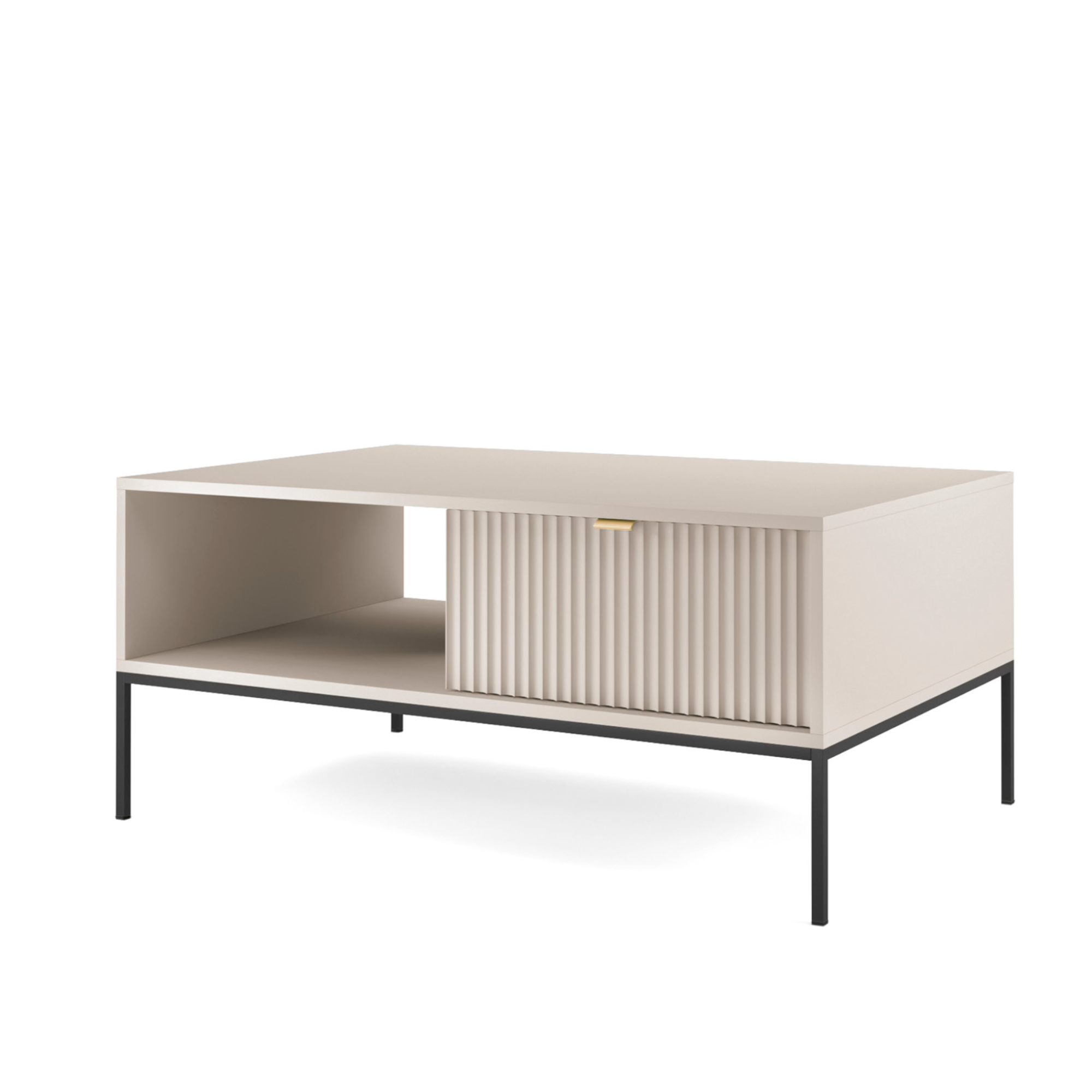 Grâce à son tiroir pratique et son étagère supplémentaire, la table basse offre un espace de rangement confortable pour les télécommandes, les livres, les petits appareils électroniques ou d’autres accessoires que vous souhaitez avoir sous la main. Sa forme géométrique simple au design rectangulaire s’accorde parfaitement avec les canapés et les coins, tandis que la façade rainurée et le cadre en acier lui donnent un caractère moderne.