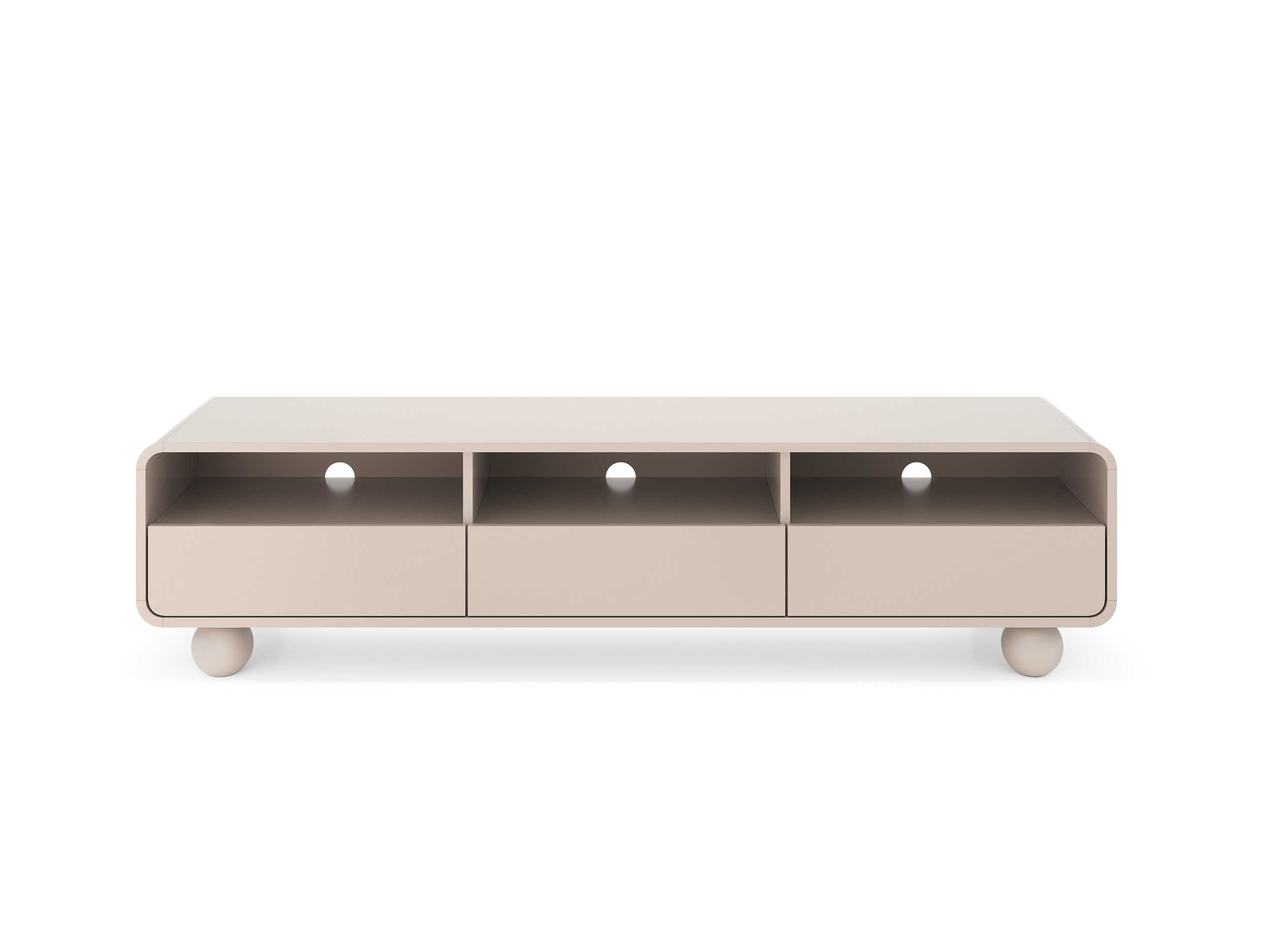 Le meuble se distingue par ses côtés arrondis en panneaux MDF de 18 mm ainsi que par ses pieds ronds subtils de 10 cm de hauteur, qui lui confèrent légèreté et un caractère élégant, tout en facilitant le nettoyage sous le meuble.