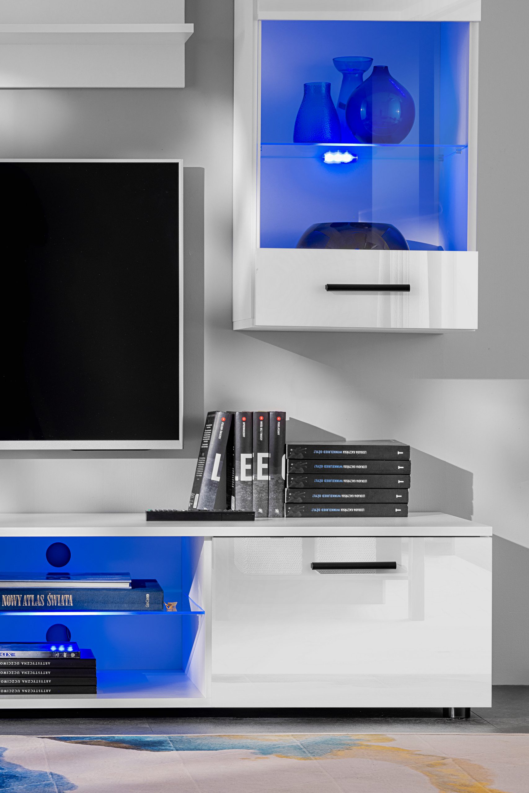 En choisissant votre éclairage LED bleu ou bien RGB, vous obtenez un éclairage pour votre meuble TV et vos deux vitrines.
